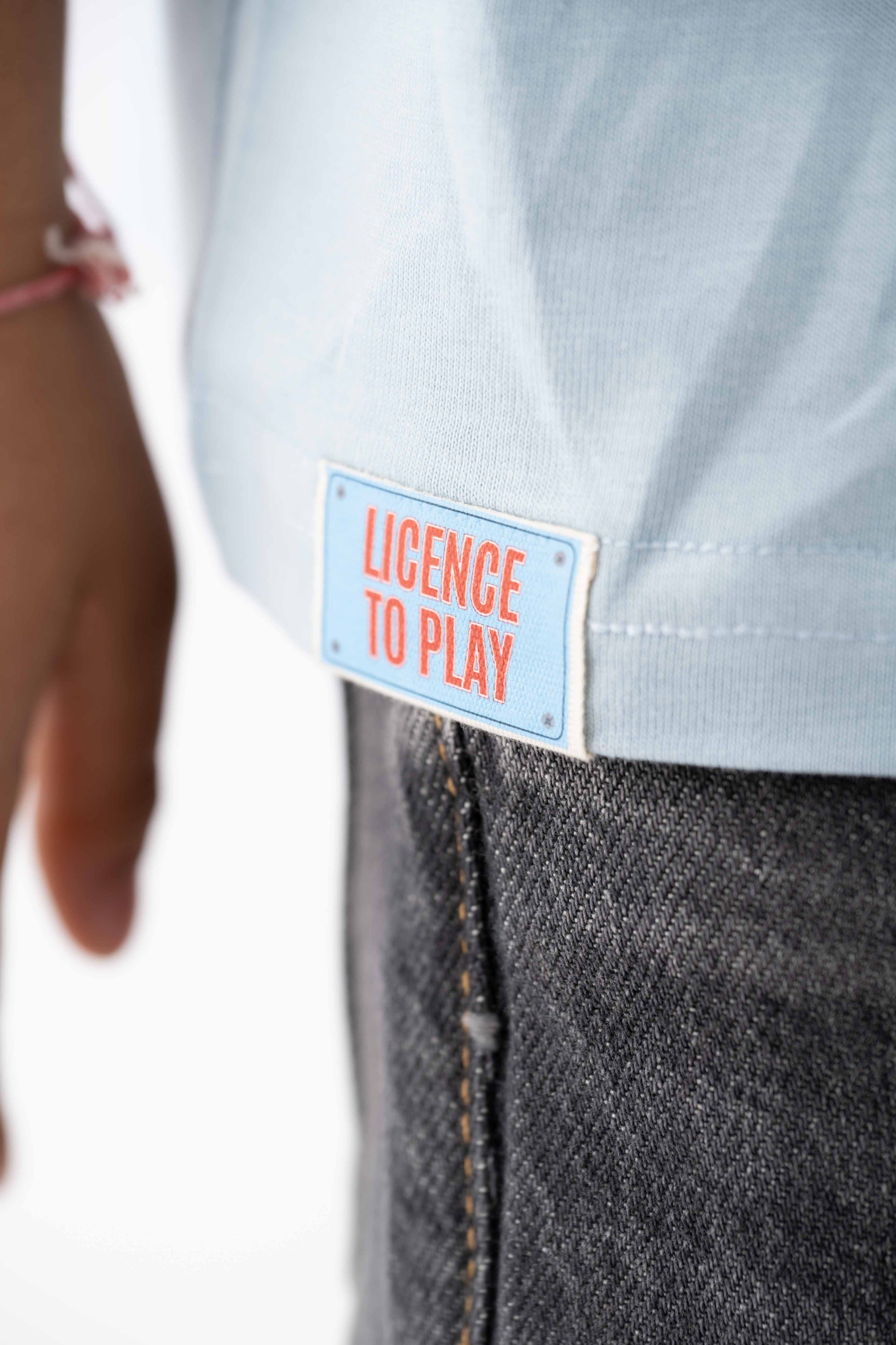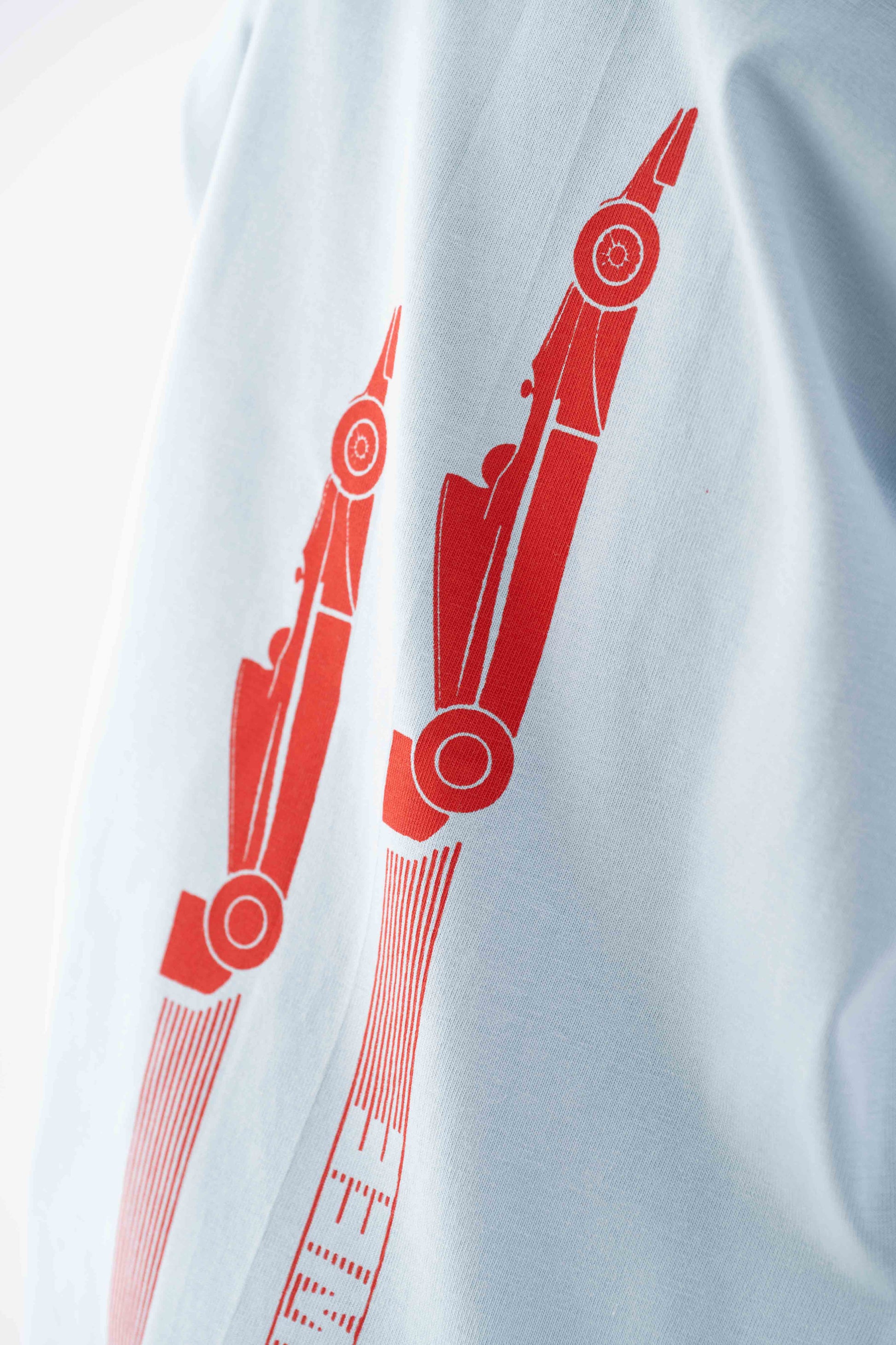 Oversized light blue tee with bold red screen prints — playful race car detail at the back and matching graphic on the front.