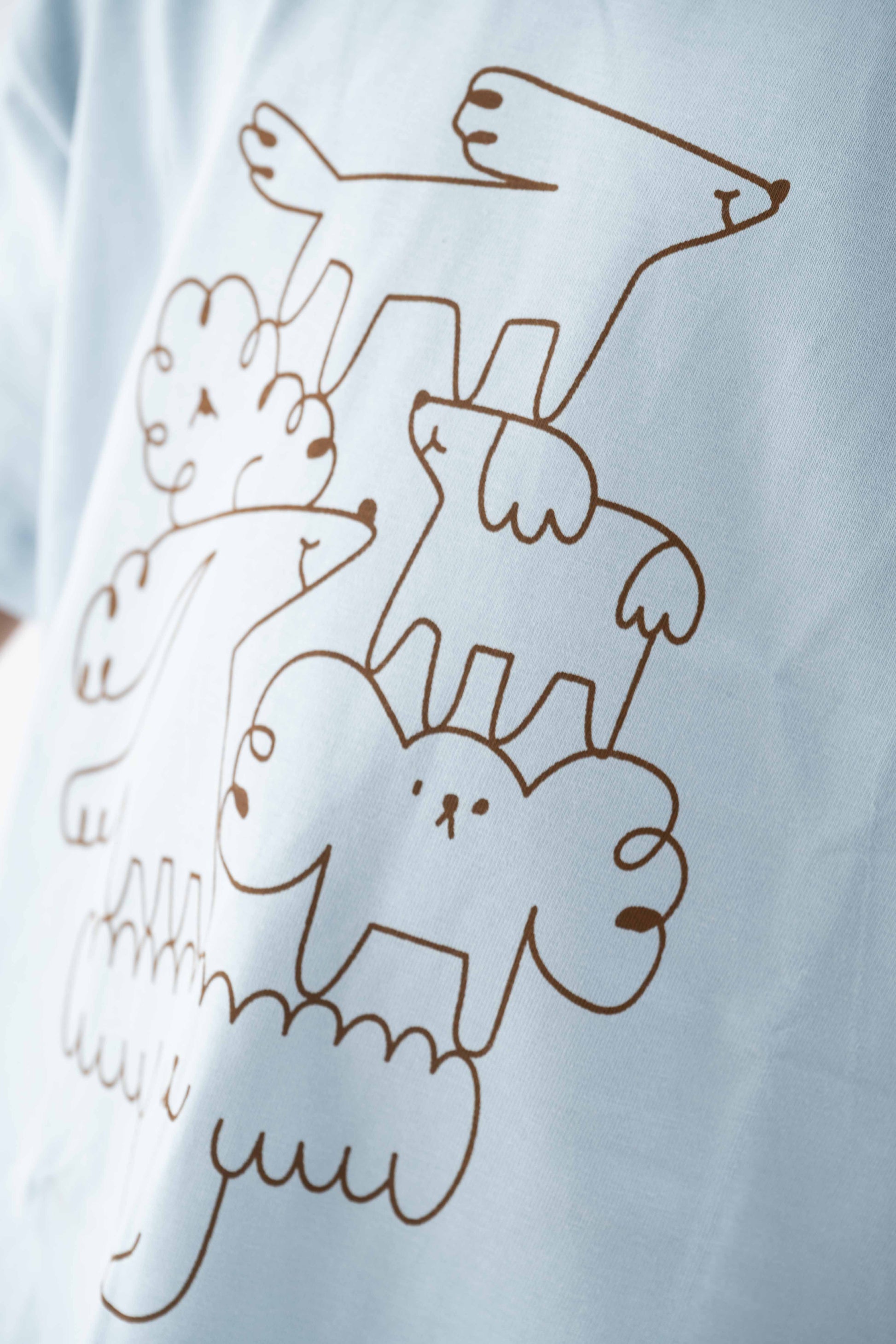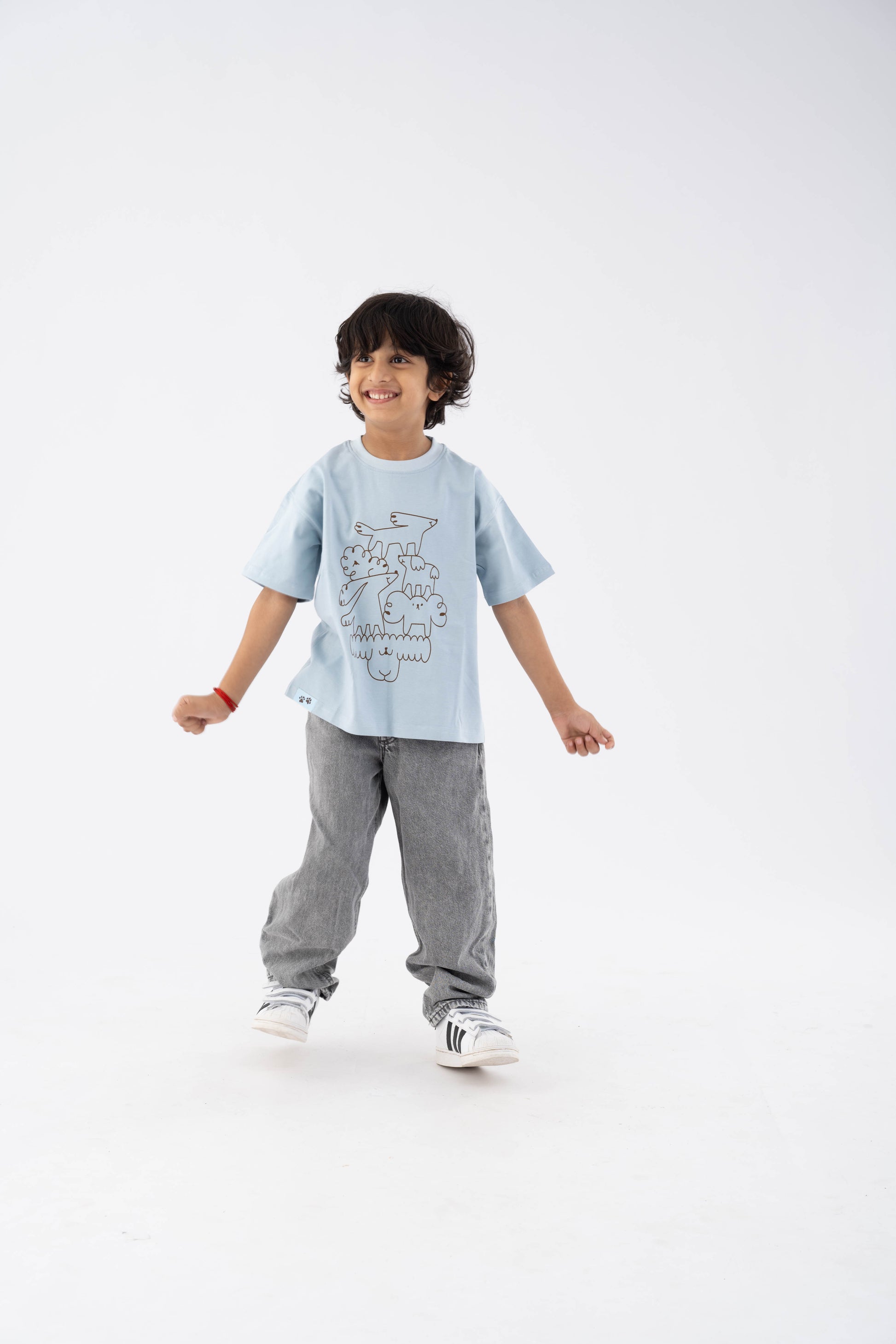 Unisex oversized light blue tee with a playful front print of stacked animal doodles, paired with a bold back print: “Stacked with Love, Balanced by Friendship.”